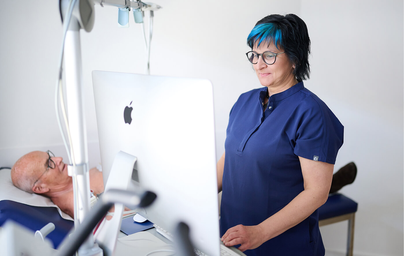 Beim Belastungs-EKG erfolgt die Ableitung der elektrischen Erregung des Herzens unter körperlicher Anstrengung auf einem Fahrradergometer. Dabei beobachten wir, wie Ihr Herz auf Belastung reagiert und ob Anzeichen einer Durchblutungsstörung auftreten. Diese Untersuchung ist wichtig zur Abklärung von Brustschmerzen, Luftnot oder zur Beurteilung der körperlichen Belastbarkeit.